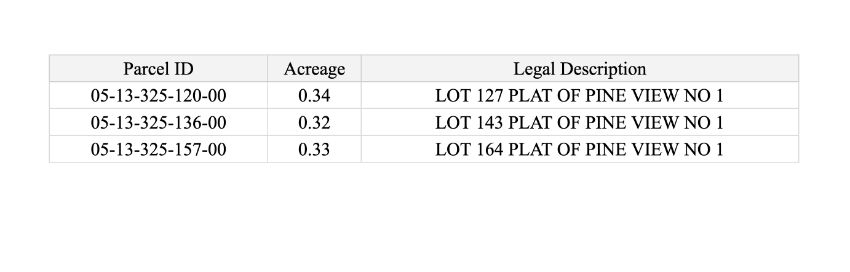 This package of three buildable lots, totaling 0.99 acre, is located in the Pine View No 1 subdivision.