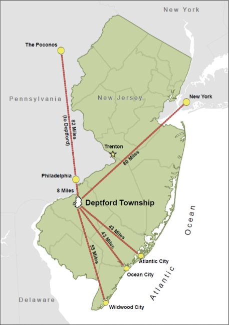 Deptford Township is situated about 10 miles southeast of Philadelphia. Its proximity to major highways, including Interstate 295 and Route 42, makes it an attractive place for commuters to Philadelphia and other surrounding areas. The township covers around 17.5 square miles, offering a blend of suburban neighborhoods, commercial districts, and recreational amenities.